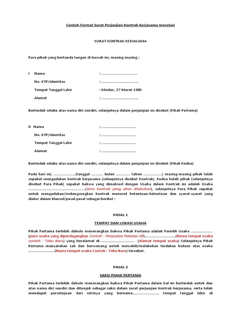 Contoh surat perjanjian kerjasama investasi by padlah in types > creative writing. Kali ini, tim portalinvestasi.com akan memberikan contoh surat perjanjian kerjasama penggaduhan sapi. Investasi adalah upaya menciptakan penghasilan atau keuntungan di masa depan, lewat suatu kegiatan yang dilakukan pada saat ini. Berikut adalah contoh surat perjanjian kerjasama bagi hasil proyeke bisnis antara dua pihak yang bersepakat untuk mendirikan sebuah restoran di daerah bogor. Dengan adanya contoh, maka anda bisa membuatnya dengan lebih mudah karena hanya tinggal meniru dan mengubah sesuai kebutuhan anda. Apa itu perjanjian kerja tetap? Download contoh surat perjanjian kerja, surat yang mengikat hubungan kedua belah pihak selama periode waktu kerja tertentu. Contoh surat perjanjian kerjasama dalam bisnis jasa usaha dan investasi bila saat ini anda sedang atau mau menjalin sebuah usahabisnis dengan rekanteman anda maka buatlah sebuah perjanjian tertulis. Mulai dari siapa perusahaan atau orang yang anda percayakan dalam kegiatan investasi hingga ketentuan dan syarat yang ada dalam kegiatan. Contoh surat perjanjian kerjasama bagi hasil bisnis. Bahwa pihak pertama adalah 3. Anda bisa menemukan contoh surat perjanjian kerjasama beserta strukturnya dengan mudah di internet. download contoh surat perjanjian kontrak kerja karyawan swasta .
