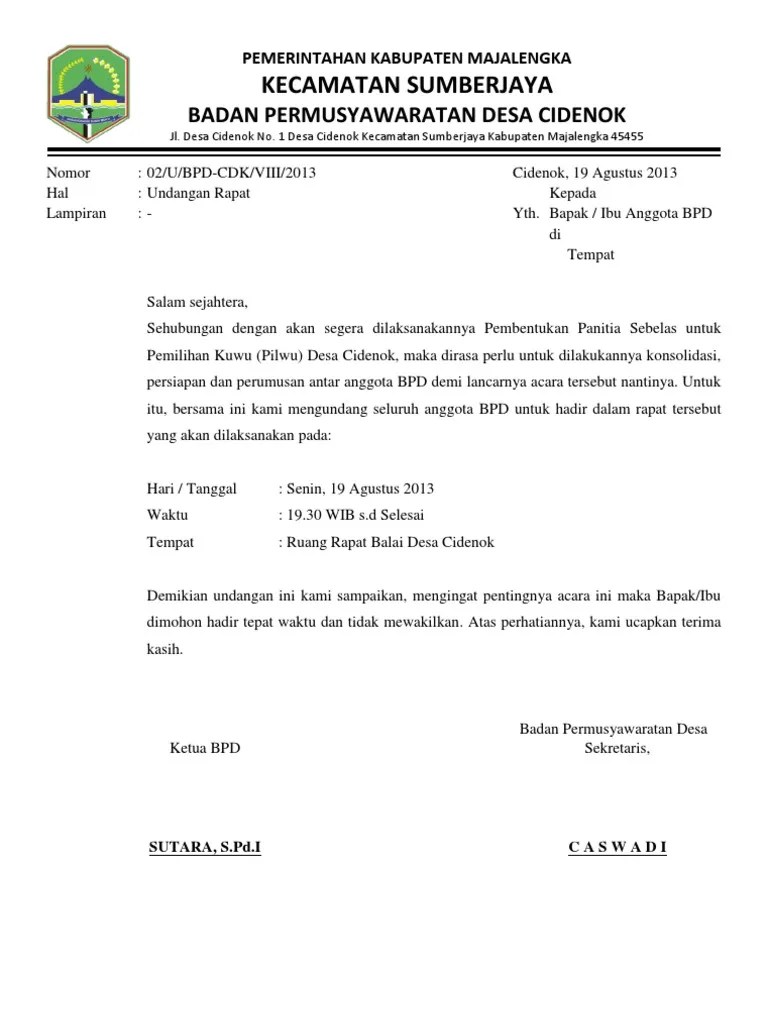Contoh Surat Undangan Rapat Musyawarah Desa Contoh Lif Co Id from imgv2-1-f.scribdassets.com Contoh surat undangan musyawarah wali santri tpq. Surat merupakan hal yang penting dalam kehidupan kita oleh karenanya acara : Melalui surat.ini kami menyampaikan undangan kepada seluruh ketua, sekretaris dan bendahara gb toba serta ketua, sekretaris dan bendahara gb toba untuk. Tetapi berbeda untuk surat undangan tidak resmi yang tidak harus diberi kop surat. Contoh surat undangan rapat osis. Download surat versi ms word dan contoh surat undangan musyawarah karang taruna pemuda desa pembentukan pengurusan baru. Ada berbagai contoh surat undangan dengan berbagai jenis kegiatan seperti surat undangan rapat. Contoh surat undangan resmi yang sejenis.