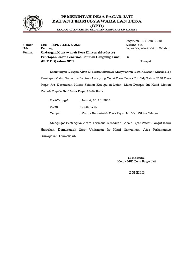 Contoh surat undangan musyawarah desa. Untuk itu, contoh surat undangan rapat yang akan dituliskan ini dapat memberikan inspirasi dan pilihan kepada anda dalam membuat surat undangan. Contoh surat resmi untuk kepala desa. Namun pada pembahasan kali ini, kami tampilkan 5 contoh surat undangan yang sering digunakan dalam khalayak umum dari sekolah sampai perusahaan, desa, dan mahasiswa. Maka dengan ini kami pengurus mengundang untuk dapat hadir yang akan dilaksanakan pada